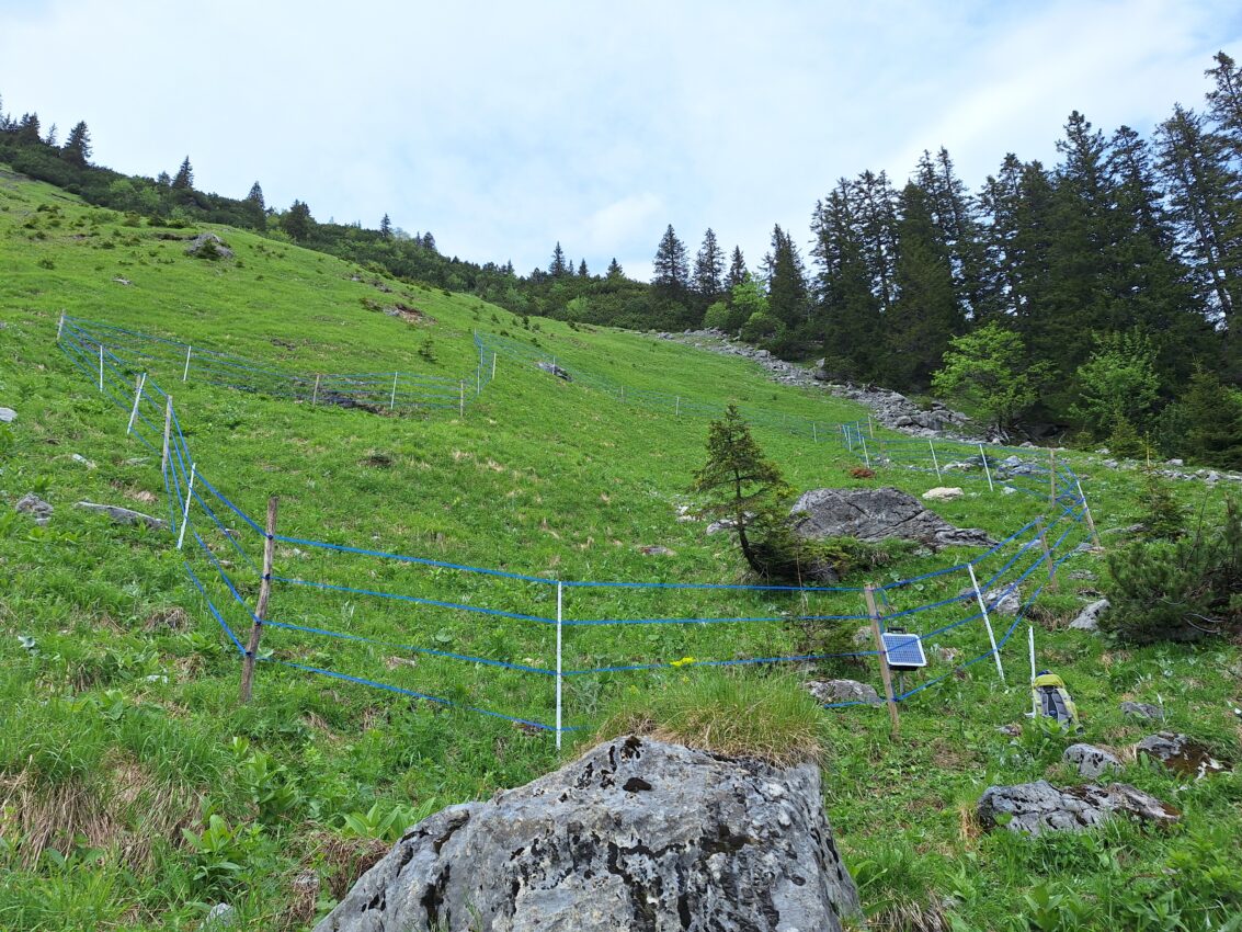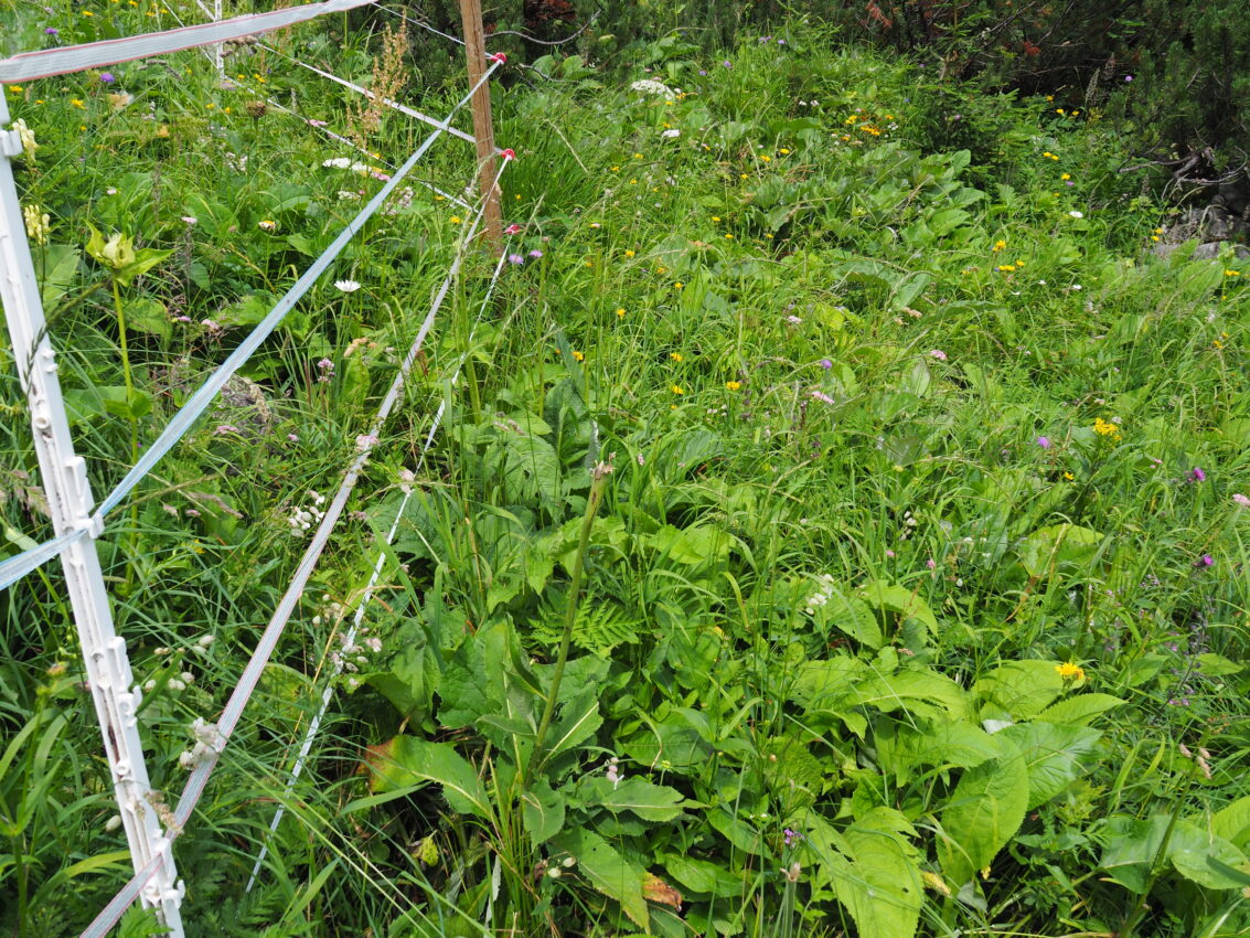 Schutzzaun zum Erhalt des Alpen-Mannstreus auf der Teilfläche „Sareis“ – Einzäunung des Gesamtbestandes © RM ESG