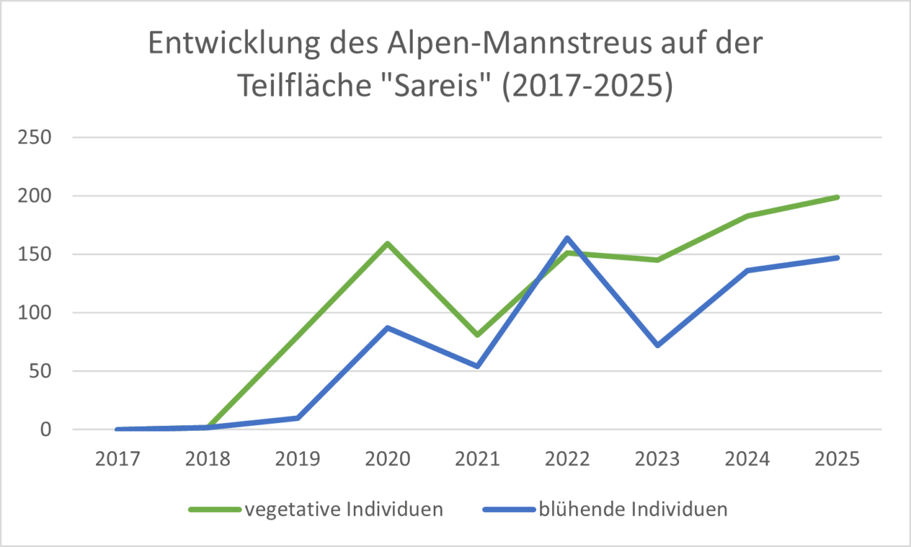 Während sich auf der östlichen Talseite des Gamperdonatals die Population des Alpen-Mannstreus seit 2009 gut erholte, nahm die Anzahl blühender Individuen im Vorkommen „Sareis“ auf der anderen Talseite stetig ab. Im Jahr 2017 konnte hier kein einziges blühendes Individuum des Alpen-Mannstreus gezählt werden und starker Verbiss charakterisierte die umgebende Hochstaudenflur. Aus diesem Grund wurde auch auf dieser Teilfläche mit einer Schutzzäunung begonnen und Erfolge ließen nicht lange auf sich warten. Seit 2018 werden im Frühjahr sämtliche austreibenden Mannstreu-Pflanzen markiert, gezählt und eingezäunt. In nur acht Jahren konnte sich der Bestand erholen und insgesamt ca. 200 Alpen-Mannstreu-Individuen gezählt werden.