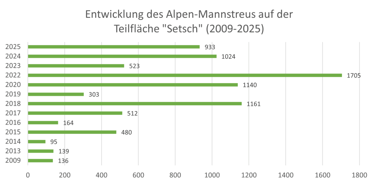 Im Zuge des begleitenden Monitorings wurde festgestellt, dass der Alpen-Mannstreu einem Blührhythmus folgt – auf ein Jahr mit hoher Blühintensität folgt ein Jahr mit geringerer. Durch die großartige Erholung des Bestandes wurde der Schutzzaun inzwischen obsolet und konnte seit 2022 weggelassen werden. Im gleichen Jahr – das überdurchschnittlich warm und sonnig war – konnte der bisherige Blüh-Höhepunkt mit über 1.700 blühenden Alpen-Mannstreu allein auf „Setsch“ festgestellt werden. Seither hält sich die Zahl der blühenden Individuen auf einem konstant hohen Niveau und betrug im Jahr 2025 trotz einem geringen Anteil blühender Pflanzen über 900 Individuen. Natürlich darf der Faktor Verbiss nicht aus den Augen gelassen werden, der im Jahr 2025 bei rund 35 % bis 45 % lag. Für den Verbiss der Blütenköpfe sind aber nicht nur Schalenwildarten wie Rotwild und Gämsen sowie Weidevieh verantwortlich. Die Beobachtungen der letzten Jahrzehnte ergaben, dass die Blüten des Alpen-Mannstreu auch für Hasen und Mäuse äußerst schmackhaft sind.