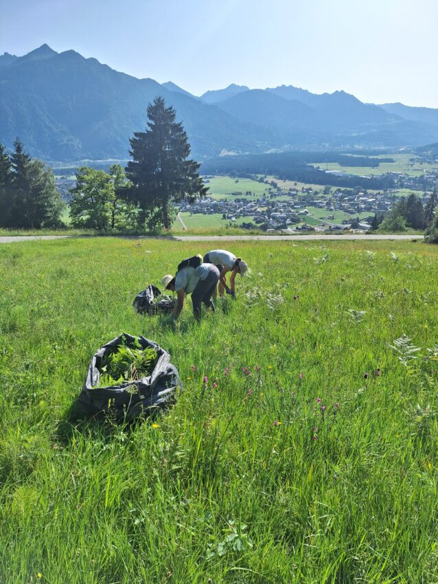 Im Europaschutzgebiet „Übersaxen-Satteins“ widmeten sich die freiwilligen Helfer:innen dem Adlerfarn auf Mager- und Feuchtwiesen ©RM ESG
