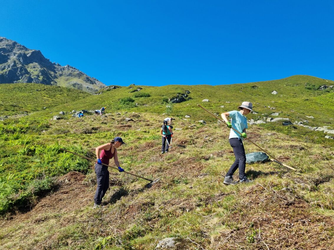 Ein zentraler Schwerpunkt der Vielfaltertage 2025 war erneut die Bekämpfung von invasiven Neophyten und Problempflanzen. In den Tallagen lag der Schwerpunkt im Juni und Juli auf der Entfernung von Springkraut entlang von Riedgräben und -böschungen sowie von Goldruten in Streuwiesen. In den Gebieten „Gleggen“, „Birken“, „Lauteracher Ried“, „Bangs-Matschels“ und „Frastanzer Ried“ wurden von vielen freiwilligen Händen bei Wind und Wetter mehrere Tonnen an Neophyten entfernt.
